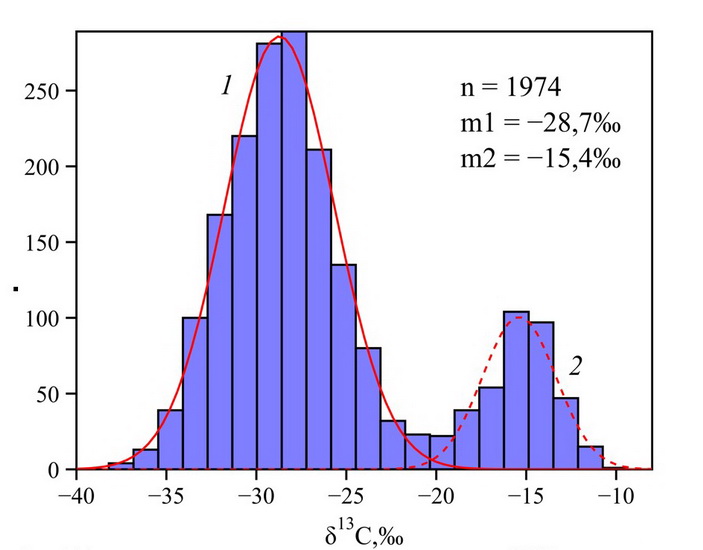 В пологе тропического леса важным сдерживающим фактором для роста эпифитов является нехватка воды. Поэтому в ходе эволюции большинство сосудистых эпифитов выработали различные приспособления к запасанию влаги и более эффективному ее использованию. Одной из таких адаптаций является САМ-фотосинтез. Благодаря ночной стадии фиксации СО2 и ряду других характерных особенностей, растения с САМ намного меньше теряют влагу по сравнению с остальными. Хотя С3-фотосинтез является наиболее распространенным среди сосудистых растений и эволюционно более простым, доля его представителей значительно уменьшается в группе сосудистых эпифитов, а доля растений с САМ соответственно растет. Выявлено несколько основных закономерностей в распределении САМ-эпифитов. Первая – это увеличение числа САМ-видов при уменьшении количества выпадающих осадков. Вторая – уменьшение числа видов с САМ с увеличением высоты произрастания над уровнем моря. Третья – увеличение доли эпифитов с САМ от средней части полога леса к более открытым участкам вершин деревьев. Важным критерием, по которому можно судить о типе фотосинтеза у растения, является изотопный состав углерода его тканей. Для выражения такого состава широко используется относительный показатель изотопной подписи углерода (δ13С). Ткани С3-растений беднее тяжелым изотопом углерода в сравнении с видами, использующими САМ-фотосинтез, поэтому возможно разделить сосудистые эпифиты на две основные группы (Рис. 1): С3 (относительно обедненные тяжелым изотопом углерода, со значениями δ13С примерно от –37 до –20‰) и САМ (относительно более богатые тяжелым изотопом углерода, со значениями δ13С от –23 до –10‰). Около двадцати процентов исследованных представителей сосудистых эпифитов проявляют значения δ13С, характерные для САМ.