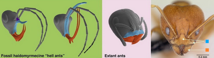 Находка адского муравья с добычей, зажатой между рогом и мандибулами, показала (и подтвердила мои догадки) еще один способ использования мандибул айдамирмексами, а также возможность движений их челюстей в вертикальной плоскости (см. заметку на «Элементах» «Охота адского муравья»). Совсем недавно обнаружены современные перепончатокрылые со сходной способностью к вертикально-латеральным движениям челюстей (Tyrannoscelio, Stentorceps, Nanocthulhu, Colotrechninae sp.) и внешним сходством формы головы и мандибул с адскими муравьями, подтвердившие реализуемость таких перестроек головной капсулы и кранио-мандибулярной системы (рис. 5).