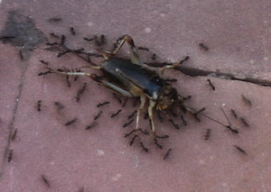 Кроновые таксоны пошли по другому пути — манипуляция предметами только между мандибулами, не привлекая наличник, — и добились успеха, варьируя размеры, форму, число зубцов мандибул с одной стороны и объем и группы мышц кранио-мандибулярной системы с другой. О большом значении контроля за движениями мандибул у современных муравьев говорит исключительное развитие у них подглоточного нервного узла, осуществляющего этот контроль. Существенное преимущество современных муравьев — это коллективная охота, когда и защиту добычи, и ее транспортировку могут осуществлять очень маленькие особи с небольшими челюстями вне зависимости от размера добычи (рис. 10).