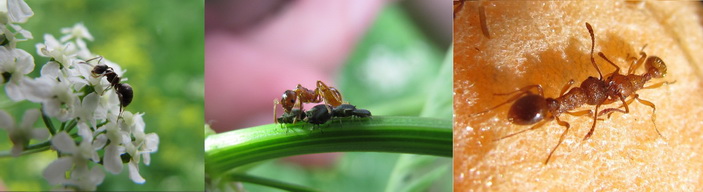 Четвертая особенность антенн муравьев в том, что вершинные членики жгутика увеличиваются в относительных размерах, так что вершинный членик самый большой (и по толщине, и по длине), а иногда последние членики жгутика могут формировать булаву. На мой взгляд, это строение объясняется теми же причинами — повышение эффективности пространственной ориентации, в данном случае за счет увеличения роли обонятельных анализаторов с меньшим по отношению к летающим перепончатокрылым вкладом зрения, уход за потомством, а впоследствии и коммуникация посредством обоняния. В связи с удлинением скапуса это приводит к увеличению числа и концентрации обонятельных рецепторов на вершинных члениках жгутика. О решающем значении обонятельных рецепторов для социального образа жизни в филогенетической ветви муравьев в сравнении с другими насекомыми, в том числе перепончатокрылыми, говорят результаты исследований мозга и геномов муравьев. Эволюция коммуникативных возможностей способствует появлению высших форм трофаллаксиса (в широком смысле это не только собственно обмен жидкой пищей, но и ее сбор, «содержание» выделяющих падь насекомых; см. рис. 7), что расширяет экологические потенции видов и способствует поддержанию высокой численности семей.