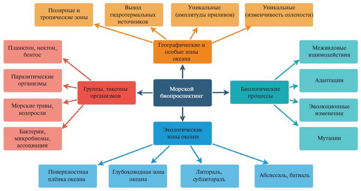 Вполне сформированным можно считать разделение биопроспектинга на наземный и морской. Авторы отмечают, что «слабо изученные морские экосистемы рассматриваются как колоссальный источник лекарственных молекул с более высокой, чем на суше, степенью химического разнообразия». К настоящему моменту вышло несколько фундаментальных обзоров достижений морского биопроспектинга, что свидетельствует о бурном развитии этого научного направления. Разнообразие результатов исследований зависит от нескольких параметров поисков: различаются цели поиска, объекты и методы (рис. 1). На данный момент основной целью морского биопроспектинга остается поиск новых биомолекул для фармацевтики и косметологии. Успехов на этом поприще достаточно для организации международных конференций (например, симпозиум “Морская биотехнология: основы и приложения” (“Marine Biotechnology: Basics and Applications”), прошедший в 2003 г. в Испании) и специализированных научных журналов как, например, «Marine Drugs». В статье приводятся примеры недавних открытий: алкалоиды губок, обладающие противомикробным действием, а также вызывающие апоптоз в опухолевых клетках. Противораковыми свойствами также обладают определенные стероидные соединения баренцевоморского вида иглокожих Cucumaria frondosa. Перспективными видятся исследования антибактериальных и антивирусных свойств гемолифмы донных беспозвоночных. Исследования кальцифицированного скелета членистоногих могут быть полезны для тканевой инженерии.