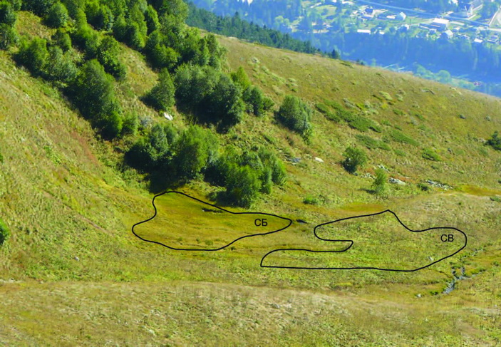 «Ранее коллективом авторов данного исследования было показано, что в альпийских растительных сообществах преобладает стресс-толерантная стратегия и в наибольшей степени выражена у растений пестроовсяницевых лугов. Роль конкурентной стратегии возрастает в условиях более продуктивных гераниево-копеечниковых лугов, а вклад рудеральной стратегии максимален в условиях альпийских ковров при коротком вегетационном периоде. » В новом исследовании ученые оценили роль функциональных признаков листьев в формировании состава растительных сообществ на примере субальпийских болот и высокотравья. В рамках этой цели выявляли значение различных функциональных признаков листьев и количественный вклад CSR стратегий растений, входящих в состав и доминирующих в этих сообществах. Для исследований были взяты сообщества локальных понижений мезорельефа субальпийского пояса в горах Северо-Западного Кавказа: в более увлажненных местообитаниях – сообщества низинных болот, в менее – высокопродуктивные сообщества высокотравья (рис. 1). Работа включала получение трех типов данных на экспериментальных площадках: 1) видовой состав надземной биомассы; 2) функциональные признаки листьев отдельных видов растений, образующих высокотравье и субальпийские болота; 3) показатели видовых вкладов CSR стратегий. На базе этих данных рассчитывали средние, средневзвешенные (с учетом участия (“веса”) отдельных видов, в качестве меры последнего выступала надземная биомасса) и средние случайные величины признаков (для случайных выборок видов из базы данных по высокогорной флоре Тебердинского национального парка) и стратегий, сравнение которых явилось основной целью исследования.