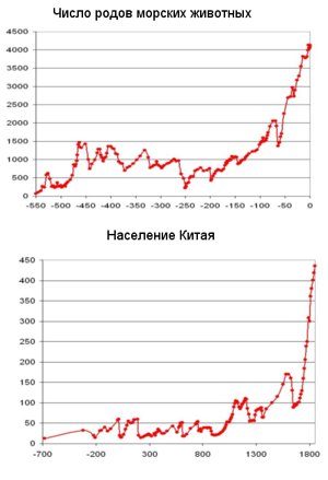 В 2005 году в Дубне на конференции, посвященной общим законам исторического развития (Big History – так называется это новое научное направление) были показаны два графика: рост населения в Китае за 2.5 тыс. лет и рост разнообразия морской биоты в течение 550 млн. лет. Сходство этих двух графиков, изображающих развитие разных объектов (население и биота), при разном масштабе времени (сотни лет и миллионы лет), выполненные в рамках разных наук (социология и палеонтология) и по разным методикам (демографические оценки – палеонтологическая летопись), тем не менее, оказалось разительным. Почему оказались похожими столь разные объекты? Тогда же в Дубне и началось обсуждение этого феномена авторами обоих графиков А. В. Марковым и А. В. Коротаевым. Результат двухлетнего обсуждения они обнародовали в совместной статье на страницах ЖОБ.