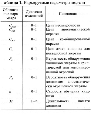 В природе некоторым видам несъедобность дается даром, в виде химических соединений кормовых растений — безобидных для жертвы, но ядовитых для позвоночных хищников, но в данной модели ядовитость предполагается платной (Cpois) — мутацией, снижающей плодовитость. Живтоное платит за несъедобность снижением плодовитости. Это одно из допущений модели. Есть здесь своя цена и у обоих видов некриптической окраски (Ccol, Cmc) (табл. 1).