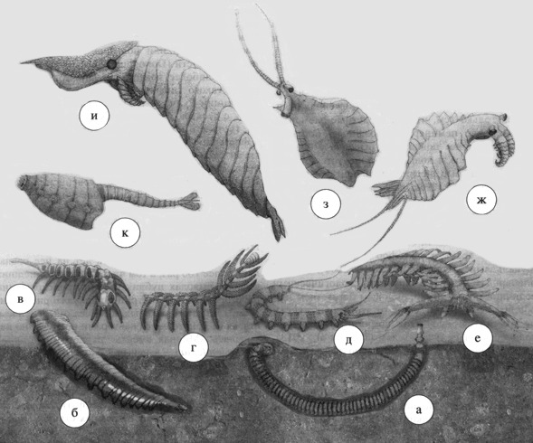 Успехи молекулярной биологии, заставившие переосмыслить базовые представления о родстве и путях эволюции крупных групп («типов») многоклеточных животных, с большим вниманием были встречены палеонтологами, чем неонтологами (т.е. биологами, изучающими современный органический мир). Это неудивительно: именно ископаемая летопись является надежным проверочным тестом для молекулярно-биологических гипотез. Палеонтологическая летопись показывает, что между различными «типами», объединяемыми ныне в ветвь Ecdysozoa (линяющие животные), – членистоногими, онихофорами, тихоходками, приапулидами, волосатиками – существовало множество переходных форм, обитавших в морской среде и вымерших еще в раннем палеозое (см. заглавную иллюстрацию).