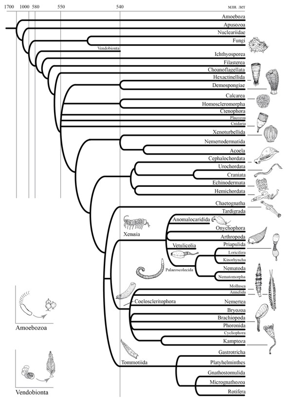 В первую очередь это были ксенузии (Xenusia) – весьма мозаичная группа, включающая червеобразных животных с лобоподными, телескопически втягивающимися ходными конечностями (как у современных тихоходок и онихофор), терминальными ротовым и анальным отверстиями и трёхслойной кутикулой, на нижней поверхности которой сохранились закономерным образом расположенные полости, где при жизни располагались коллагеновые волокна (как в кутикуле круглых червей). Ротовое отверстие располагалось на кончике хоботка, который у некоторых форм был втяжным (как у головохоботных червей). Облик этих организмов вполне соответствует гипотетическим исходным формам, которые должны были существовать, судя по онтогенезу (индивидуальному развитию) онихофор. Переход части ксенузий к роющему образу жизни дал начало головохоботным червям, у древнейшей группы которых – палеосколецид – сохранилась кутикула, состоявшая из точно таких же склеритов (фосфатизированных пластинок), как у ксенузий, и редуцированными в различной степени лобоподными конечностями, крайним случаем редукции которых были сенсорно-железистые придатки – тубули, расположенные двумя отчётливыми вентро-латеральными (т.е. по бокам брюшной стороны) рядами. Другие группы ксенузий дали онихофор, перешедших к наземному существованию, тихоходок – мейобентосную группу и аномалокаридид – крупные нектонные формы, утратившие ходные конечности и вымершие в палеозое (рис. 1). Остатки каких-либо животных, которые даже с очень большой натяжкой можно было бы рассматривать как промежуточные формы между членистоногими и кольчецами, в ископаемой летописи полностью отсутствуют.