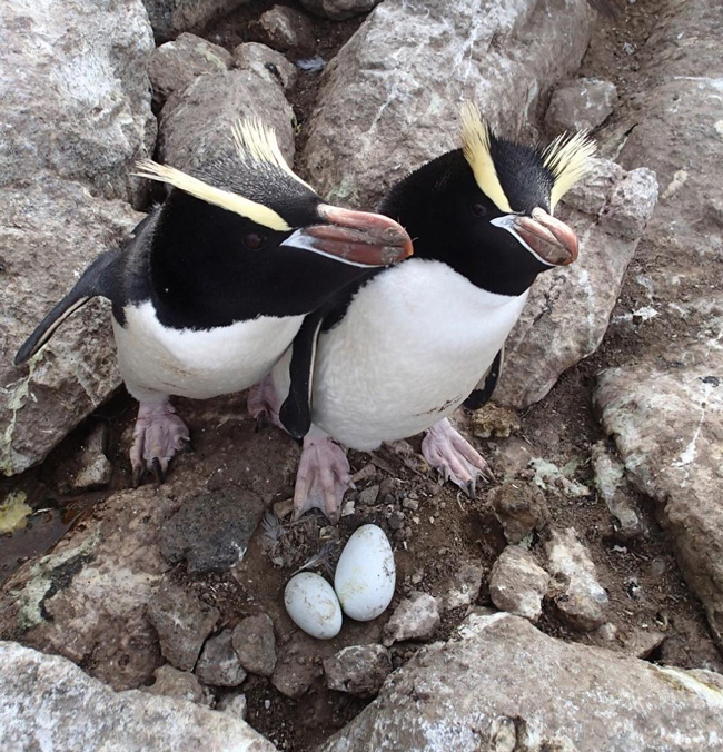 На фото с сайта nzbirdsonline.org.nz — пара больших хохлатых пингвинов (Eudyptes sclateri) с кладкой.