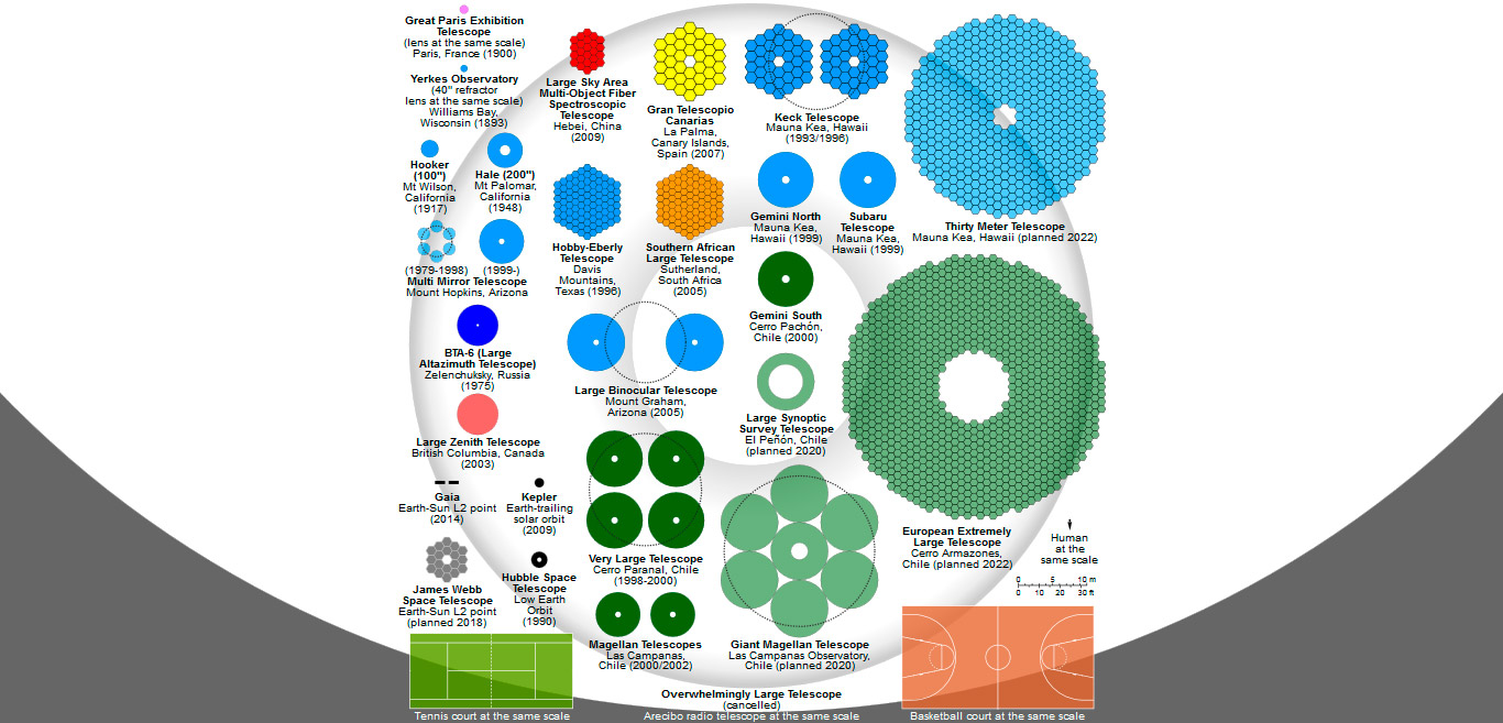 Техника, с которой сейчас работают астрономы, настолько продвинутая, что они могут заглядывать почти в самые далекие (а значит, и самые древние) уголки Вселенной. Но, как это часто бывает, например, в спорте, — чтобы еще чуть-чуть улучшить и без того первоклассный результат, нужны колоссальные усилия. Чтобы телескоп мог видеть более тусклые объекты, он должен собирать больше света. Поскольку лишнее наблюдательное время взять неоткуда, приходится увеличивать размеры телескопов. К счастью, технологии вроде активной и адаптивной оптики это позволяют.