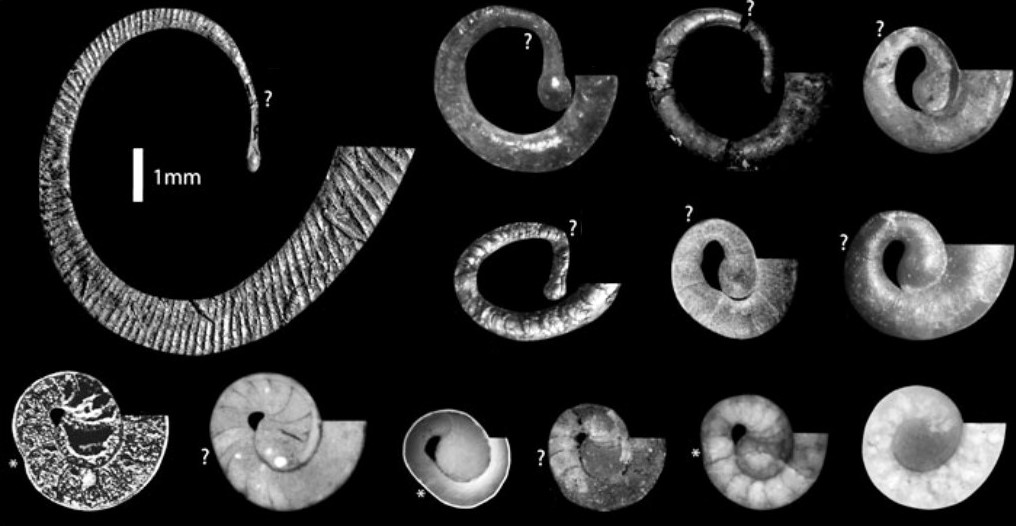 Начальные части раковин девонских аммоноидей с сохранившейся эмбриональной (то есть сформированной в яйце) частью. Граница эмбриональной раковины отмечена либо звездочкой (если авторы уверены в ее расположении), либо знаком вопроса (если авторы не совсем уверены). Фото из статьи K. De Baets et al., 2012. Early evolutionary trends in ammonoid embryonic development