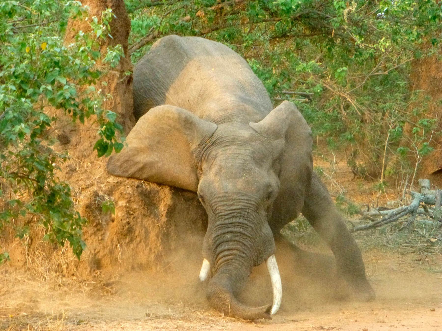 На фото — самец африканского саванного слона забрался на гигантский термитник, чтобы добраться до плодов растущего рядом тамаринда. Это безобразие происходит в национальном парке Южная Луангва в Замбии. Обычно слоны во время кормления настроены деструктивно: чтобы добраться до сочных листьев или плодов деревьев, они ломают ветки или валят деревья.
