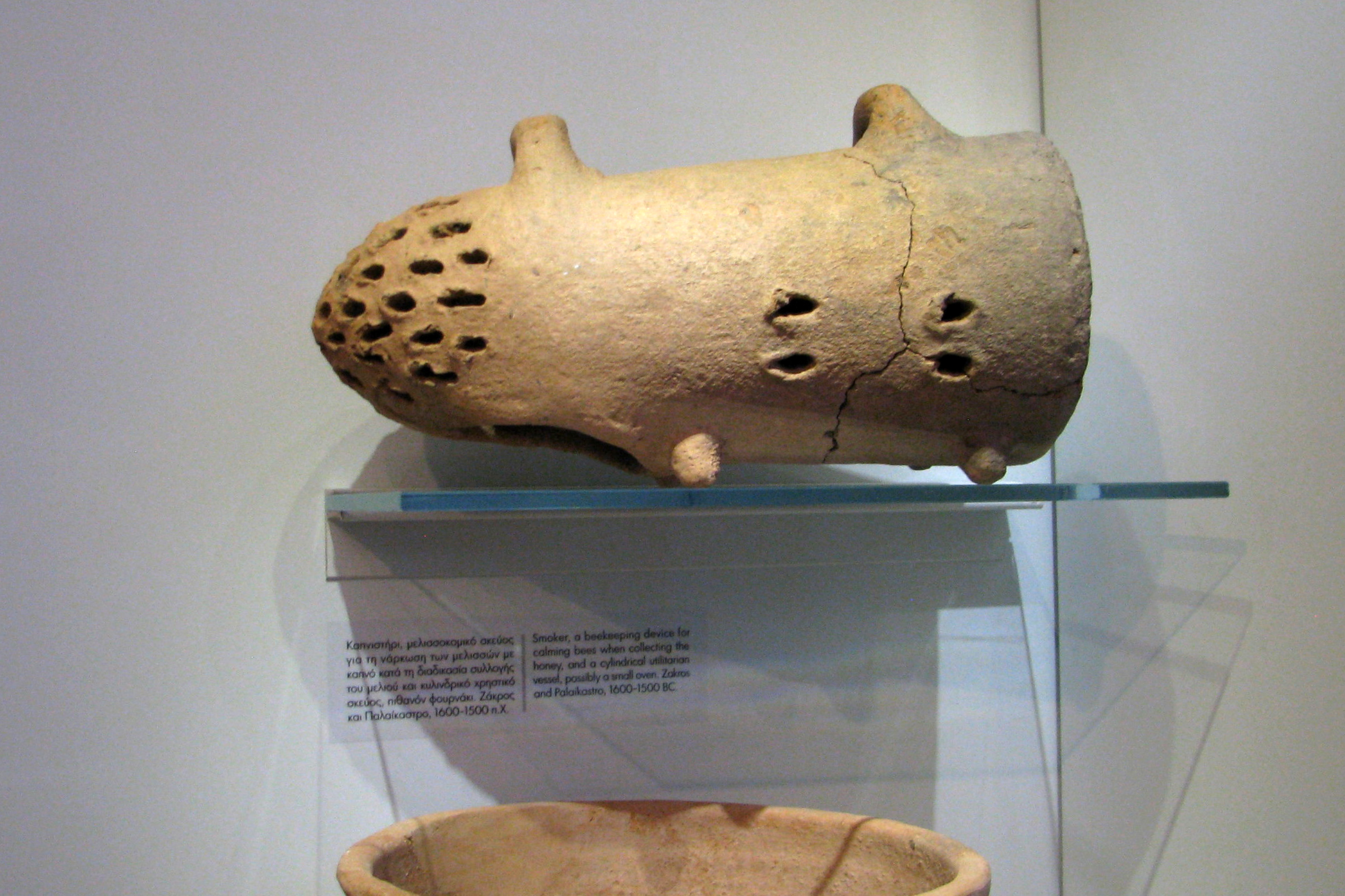 Еще один экспонат Археологического музея Ираклиона, связанный с пчелами, — сосуд для окуривания пчел, найденный в Закросе и датируемый 1600–1500 гг. до н. э. Такие сосуды использовались, чтобы успокоить насекомых во время сбора меда. Фото © Юлия Михневич, Археологический музей Ираклиона