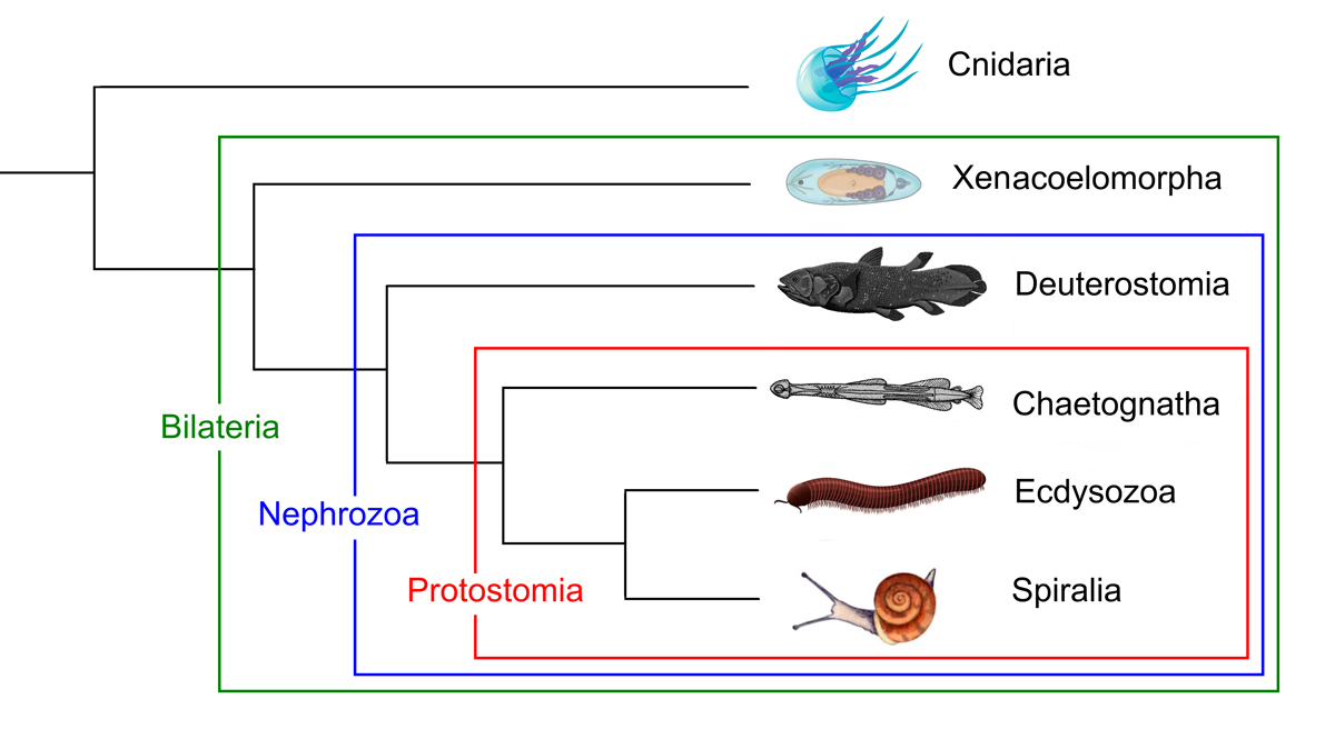 Большая группа, эволюция которой отражена на этой картинке, в современных публикациях называется Planulozoa. Мы видим, что самой первой от ее ствола отходит ветвь стрекающих (Cnidaria), в которую входят всевозможные медузы, кораллы и гидры. Следующая ветвь — уже упомянутые ксенацеломорфы, после них отходит ветвь вторичноротых (Deuterostomia), в которую входит три современных типа животных — иглокожие, полухордовые и хордовые. Все оставшиеся ветви называются первичноротыми (Protostomia); к ним относится обособленный тип морских стрелок (Chaetognatha) и две гигантские группы беспозвоночных, включающие вместе больше десятка типов — спиральные (Spiralia) и линяющие (Ecdysozoa). На «Элементах» можно познакомиться с краткими обзорами разнообразия этих групп (Платизои ставят под сомнение происхождение двусторонне-симметричных животных от целомического предка, «Элементы», 23.06.2014; Китайские палеонтологи нашли древнейшего головохоботного червя, «Элементы», 04.06.2014). Всех Planulozoa, кроме стрекающих, по традиции называют двусторонне-симметричными (Bilateria), хотя далеко не факт, что это название правомерно: есть обоснованное мнение, что у стрекающих двусторонняя симметрия изначально тоже была (В. В. Малахов, 2004. Новый взгляд на происхождение билатерий). И наконец, все двусторонне-симметричные животные, кроме ксенацеломорф, в современной терминологии называются Nephrozoa (букв. ‘имеющие нефридии’, то есть выделительные трубочки). Группа Nephrozoa распадается на крупные ветви вторичноротых и первичноротых, к первой из которых относимся и мы.