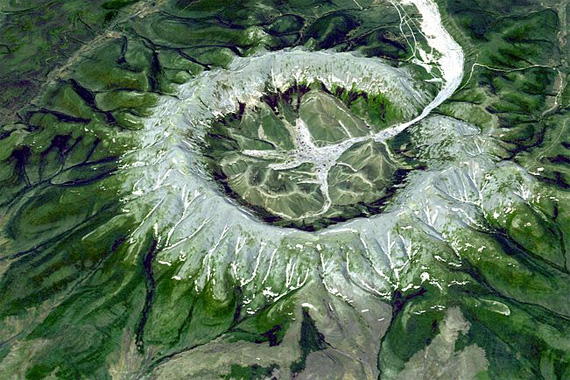 На этом цифровом изображении показан рельеф двух островов Курильской гряды — Онекотана и Маканруши, — разделенных проливом Евреинова. Изображение сориентировано так, что наблюдатель смотрит по направлению на северо-запад. На переднем плане находится остров Онекотан с кальдерами двух вулканов. Более крупный вулкан в южной части острова — вулкан Креницына. Его южная кальдера, Тао-Русыр, заполнена водой, образуя озеро Кольцевое, из которого поднимается новый вулканический конус. Стенка кальдеры вулкана Креницына носит название Кольцевой хребет. На севере острова находится вулкан Немо. Его кальдера заполнена водой лишь частично, так что рядом с вулканическим конусом образовалось озеро Черное. Стенка кальдеры вулкана Немо также имеет свое собственное название — Советский хребет.