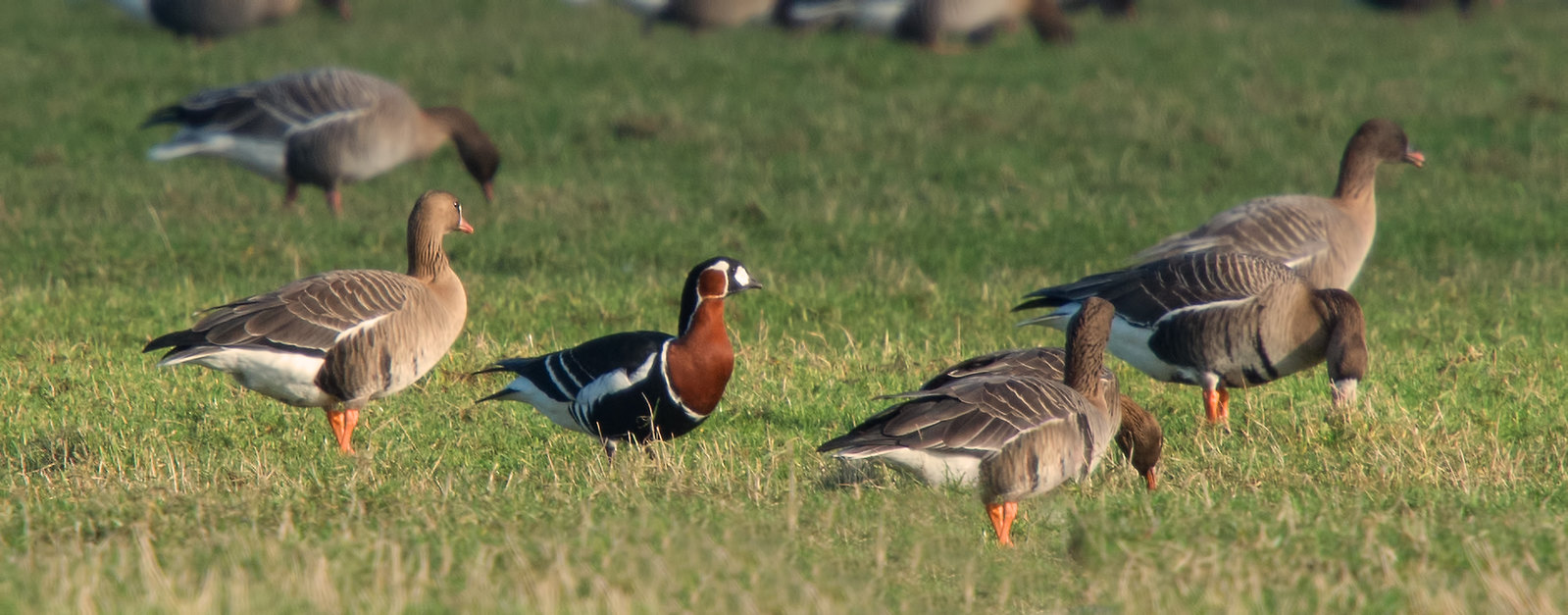 Краснозобая казарка среди более крупных белолобых гусей. Фото © John Tymon с сайта flickr.com