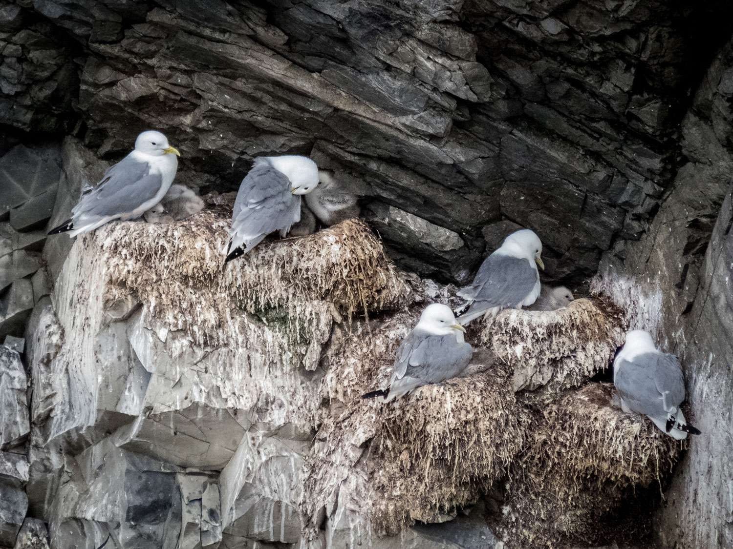 Птенцы моевок, в отличие от других чаек, сидят в гнезде смирно и не вступают в конфликты друг с другом. Это и немудрено в условиях, где шаг в сторону — верная гибель, ведь часто малыши с трудом помещаются на крошечной площадке, и их хвостики свисают в пропасть. Кроме того, неподвижного птенца тяжелее заметить пернатому хищнику, например грозной чайке бургомистру