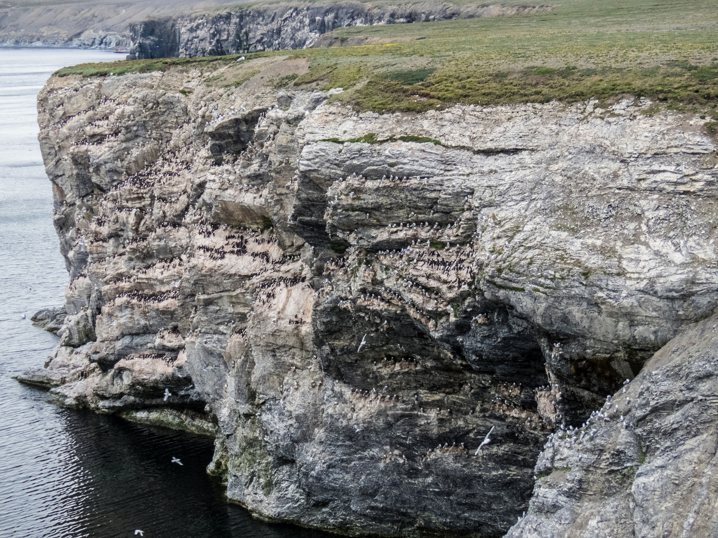 Колонии моевок и кайр на мысе Саханина. Если увеличить фотографию, то можно разглядеть серые спины моевок на гнездах и черные силуэты кайр. На вершине скалы виднеется крупная светлая чайка. Это и есть бургомистр, он гнездится тут же и кормится яйцами, птенцами и молодыми моевками и кайрами