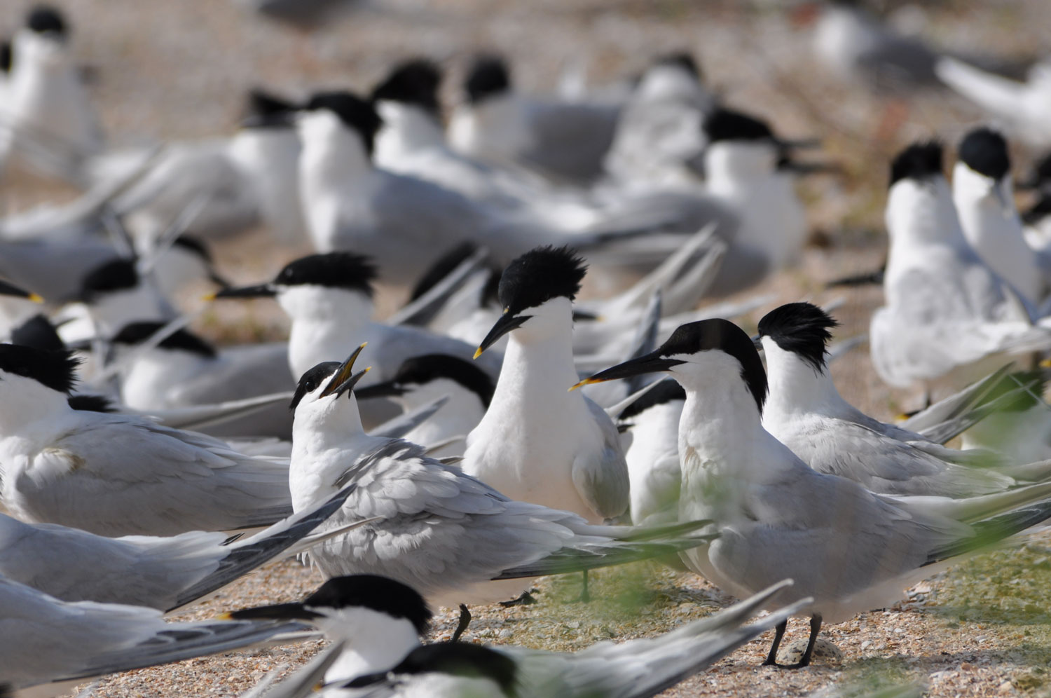 В особенно плотных центральных частях колонии пестроносые крачки сидят чуть ли не на головах друг у друга