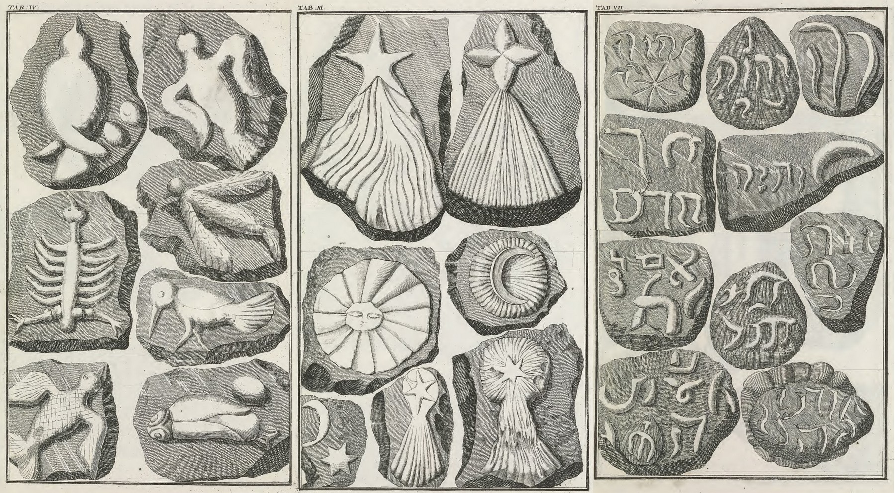 Иконолиты с птицами, астрономическими объектами и буквами еврейского алфавита. Иллюстрации из книги Берингера «Lithographiae Wirceburgensis» (2-е издание, 1767 год)