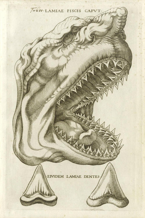 Ископаемые зубы акул и голова современной акулы (считается, что она успела немного испортиться до того, как была зарисована, и из-за этого выглядит несколько странно). Иллюстрация из публикации Нильса Стенсена 1667 года с сайта scihi.org