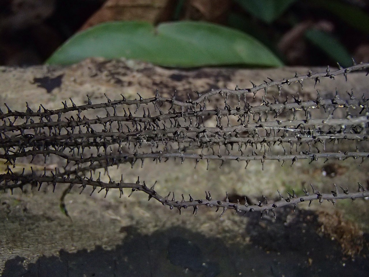 Не все виды рода Thamnomyces оправдывают свое латинское название «гриб-куст» (см. картинку дня Гриб-куст) — некоторые формируют прямые и вытянутые длинные стромы со множеством крупных перитециев. В лесу такие стромы почти метровой длины можно принять за колючую проволоку — в чем легко убедиться, взглянув на изображенный на фото гриб Thamnomyces chordalis.