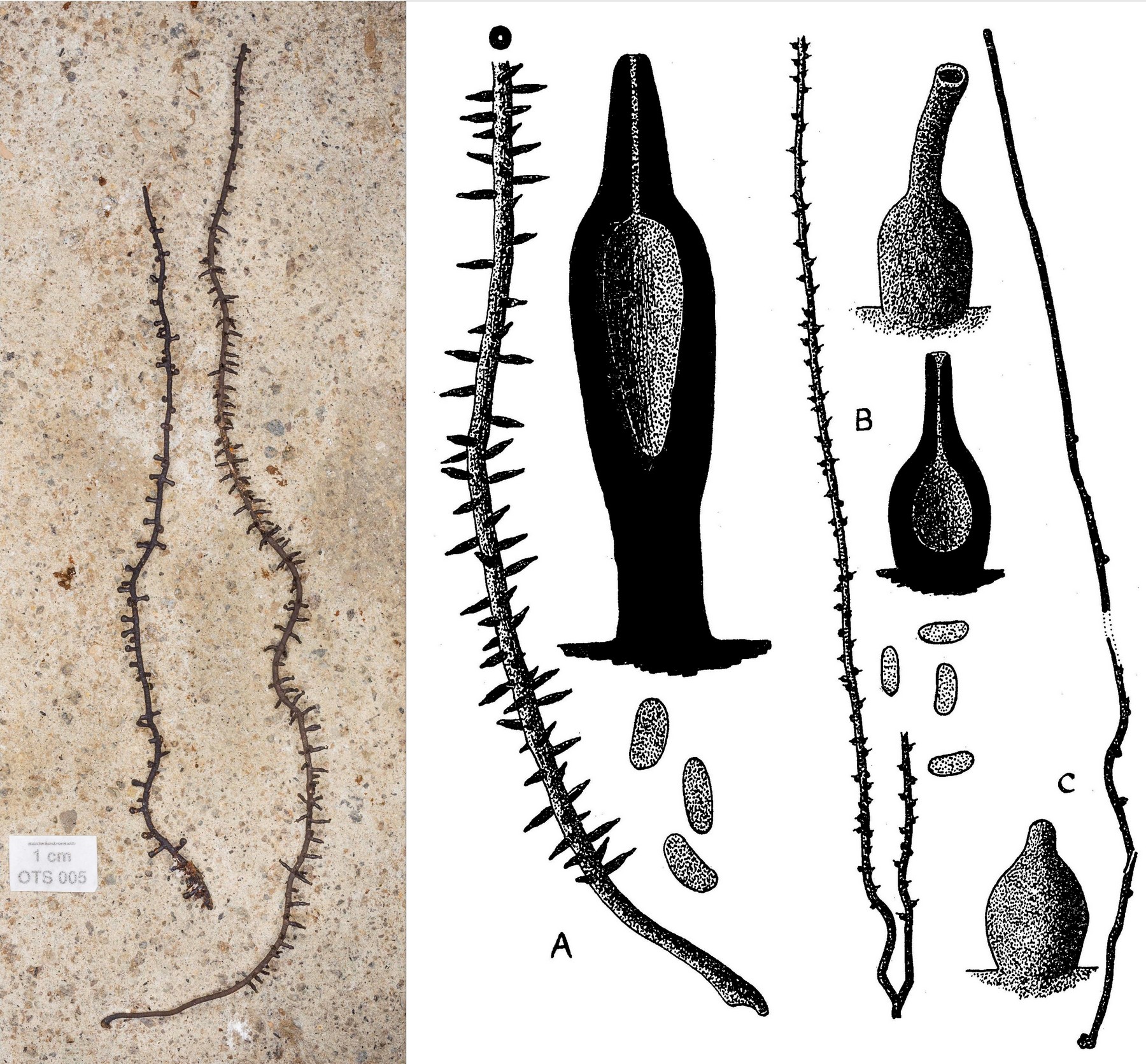 Виды рода Thamnomyces с длинной стромой. Слева — фото двух видов Thamnomyces. Фото © Danny Newman (myxomop) с сайта mushroomobserver.org. Справа: А — Thamnomyces fuciformis; B — T. rostratus; С — T. chordalis. Изображение из статьи R. W. G. Dennis, 1957. Further notes on Tropical American Xylariaceae