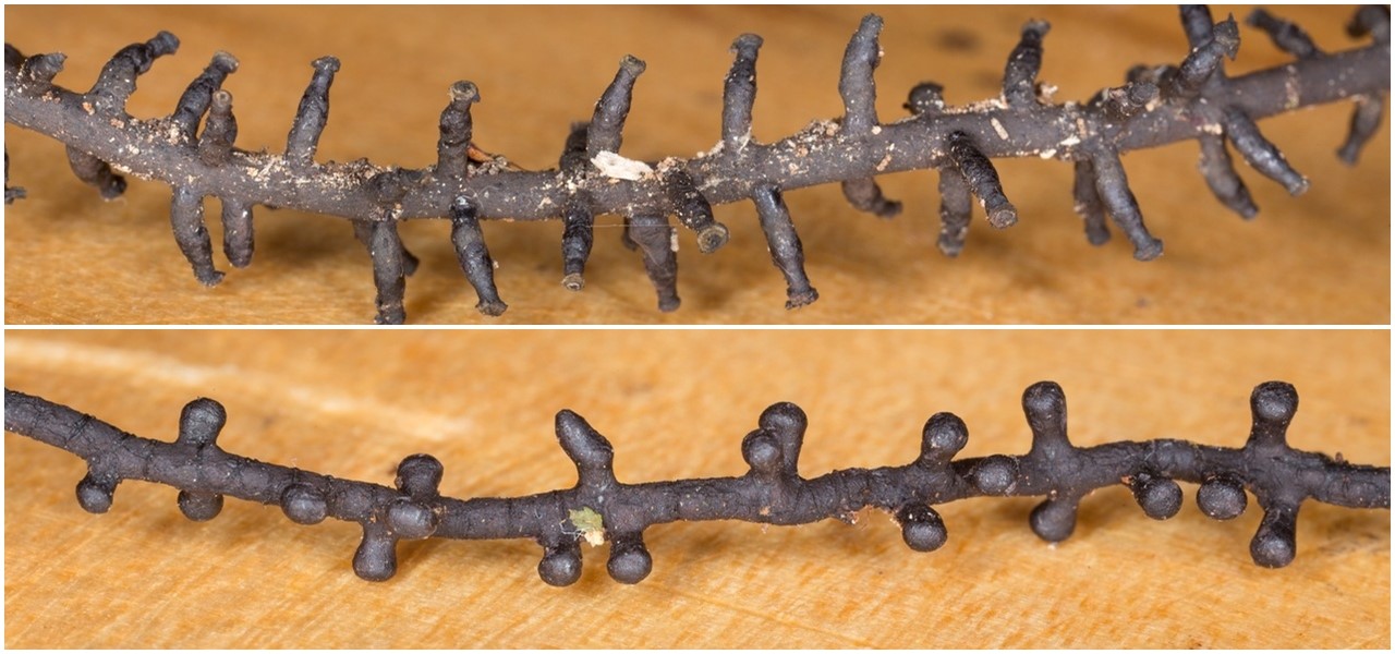 Сильно меланизированные хрупкие стромы гриба Thamnomyces chordalis с торчащими во все стороны перитециями. Фото с сайта www.mycokey.com