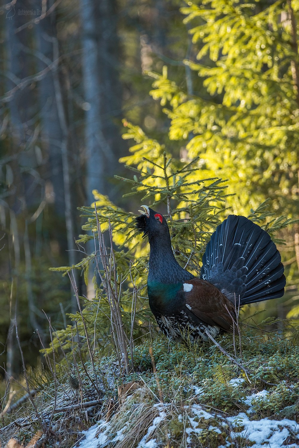 На фото запечатлен самец глухаря (Tetrao urogallus) во время токования: хвост поднят и распущен веером, голова задрана кверху, концы крыльев опущены — птица исполняет брачную трель. Ток глухарей — это таинственное действо, наполненное неизменными ритуалами.