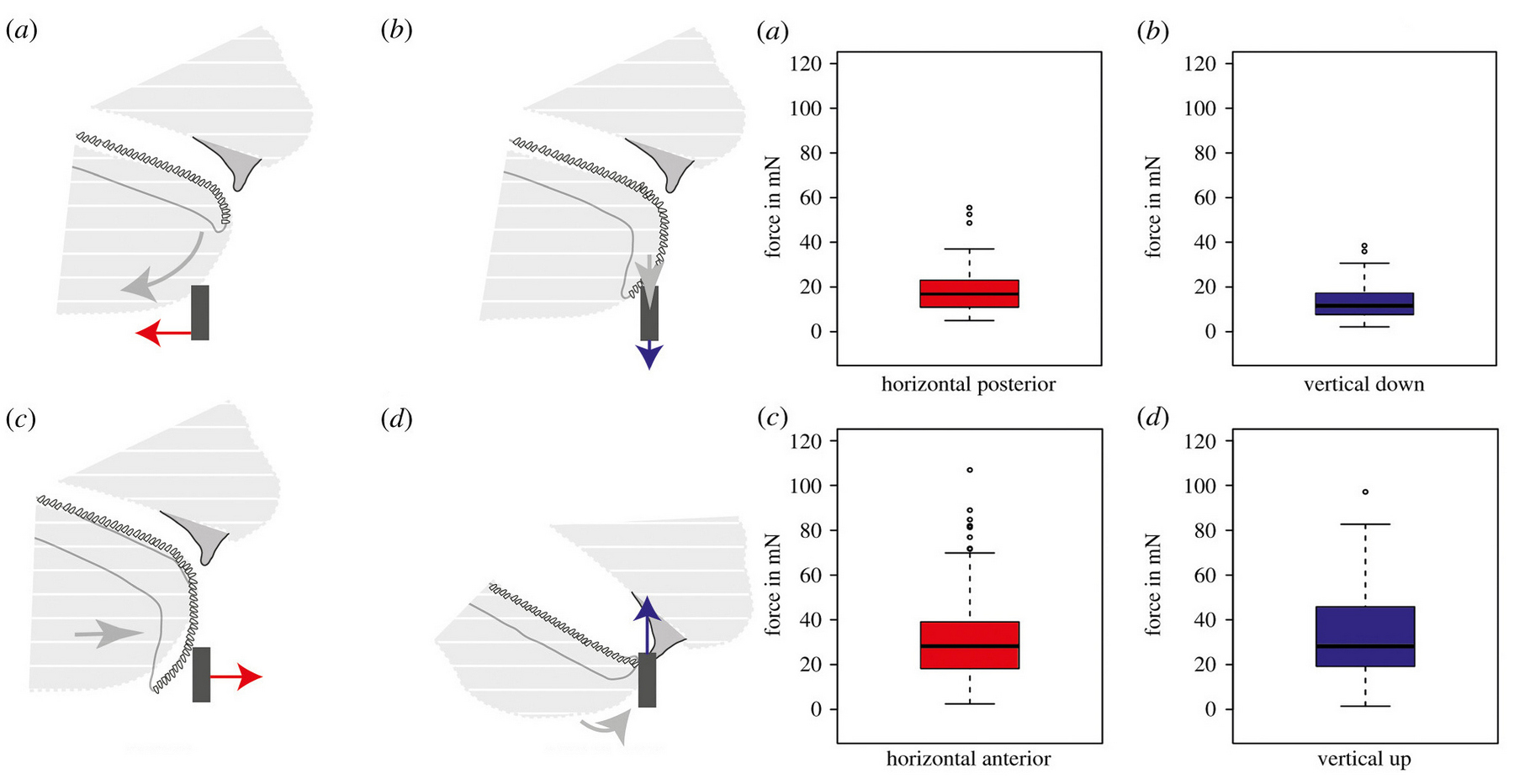Основные движения ротового аппарата улитки и возникающие при этом результирующие силы. Черный прямоугольник на схемах соответствует капилляру, цветные стрелки — направлениям действующих на него сил. Движения частей ротового аппарата показаны серыми стрелками. Величины возникающих сил в миллиньютонах показаны на диаграммах. Данные усреднены по десяткам замеров, сделанных для 7–12 улиток. (a) край глотки («губа») движется вниз и назад, приближая радулу к капилляру. (b) радула движется вниз. (с) радула движется вперед и трет капилляр. (d) радула прижимает капилляр к челюсти, соскребая частицы пищи. Изображение из статьи W. Krings et al., 2019. In slow motion: radula motion pattern and forces exerted to the substrate in the land snail Cornu aspersum (Mollusca, Gastropoda) during feeding