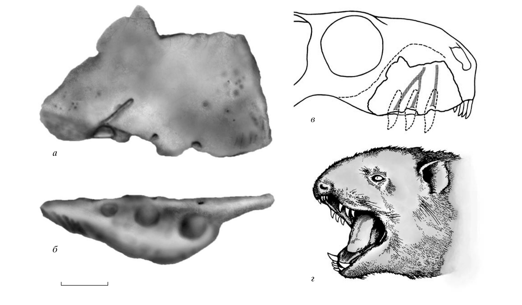 Голотип мегавайтсии (а, б — вид снаружи и снизу), а также его расположение на черепе животного (в) и реконструкция внешнего вида (г). Длина масштабного отрезка — 2 см. Рисунок из статьи: М. Ф. Ивахненко, 2008. Первый вайтсиид (Therocephalia, Theromorpha) из терминальной перми восточной Европы