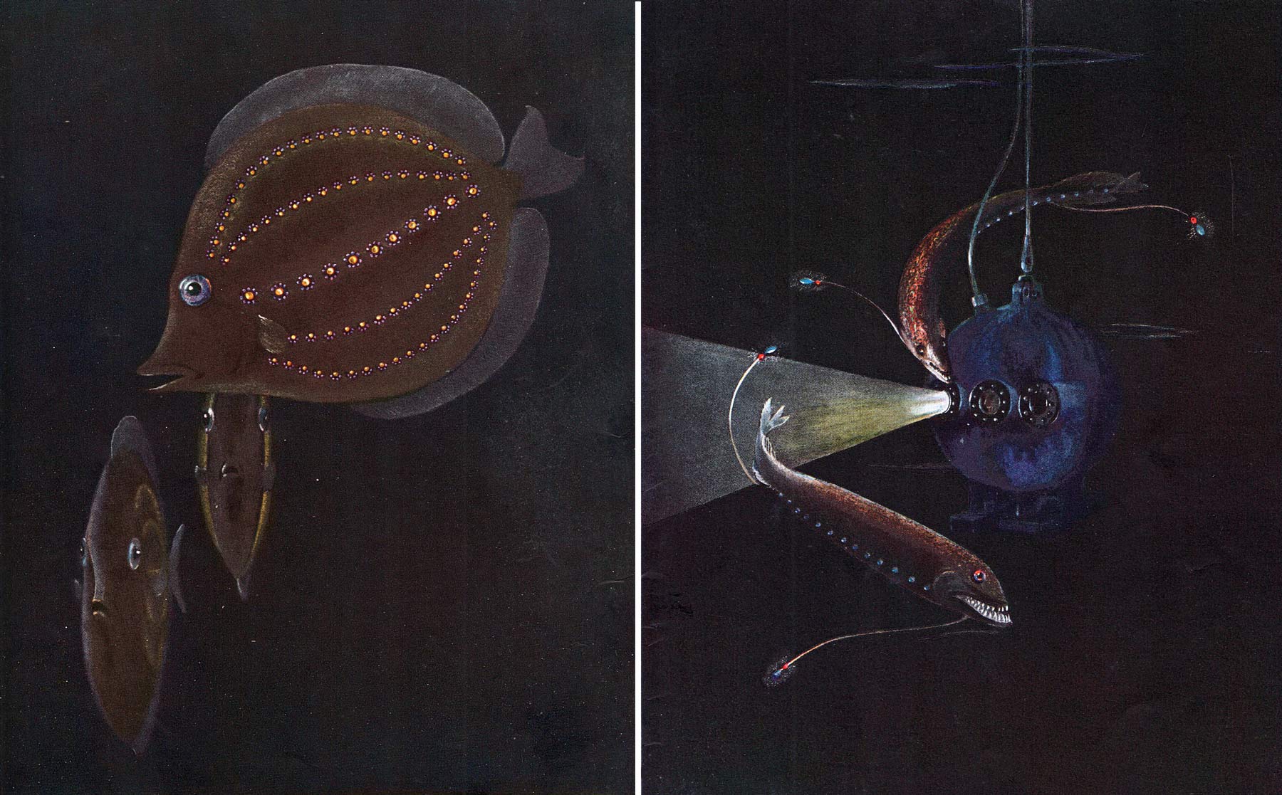 Картины работы Эльзы Бостельман, на которых изображены описанные Бибом виды, так и не встреченные больше никем до сих пор. Слева — Bathysidus pentagrammus; справа — две особи Bathysphaera intacta кружат вокруг батисферы. Изображения с сайта gallery.obs-vlfr.fr