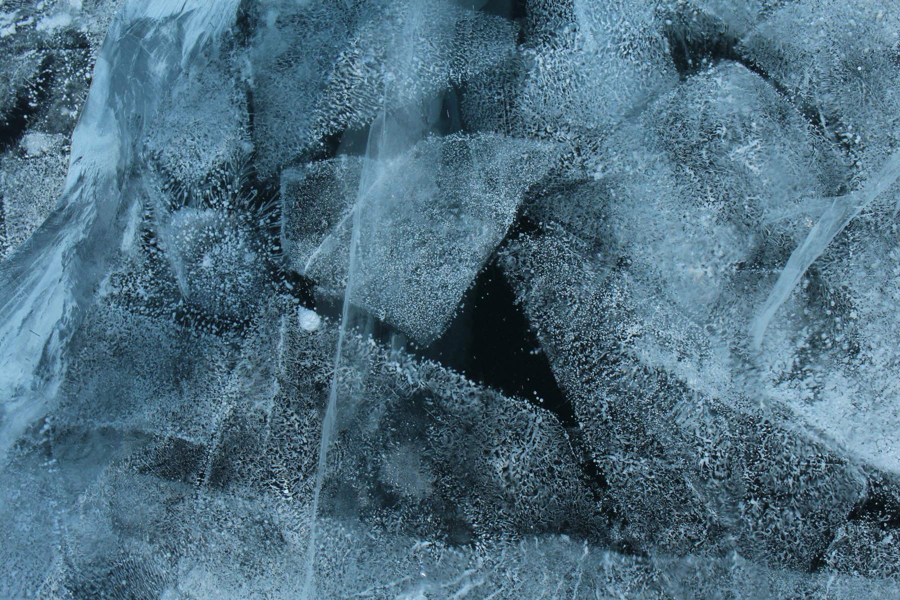 На фото изображены вмерзшие в байкальский лед пузырьки метана. Метановых пузырьков во льду Байкала много, они бывают самого разного размера — от практически невидимых невооруженным глазом до крупных, доходящих до десятков сантиметров в диаметре и располагающихся друг под другом.