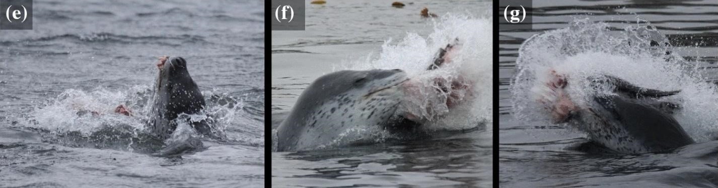 Морской леопард треплет добычу — кергеленского морского котика. Фото из статьи J. R. Robbins et al., 2019. A rare observation of group prey processing in wild leopard seals (Hydrurga leptonyx)