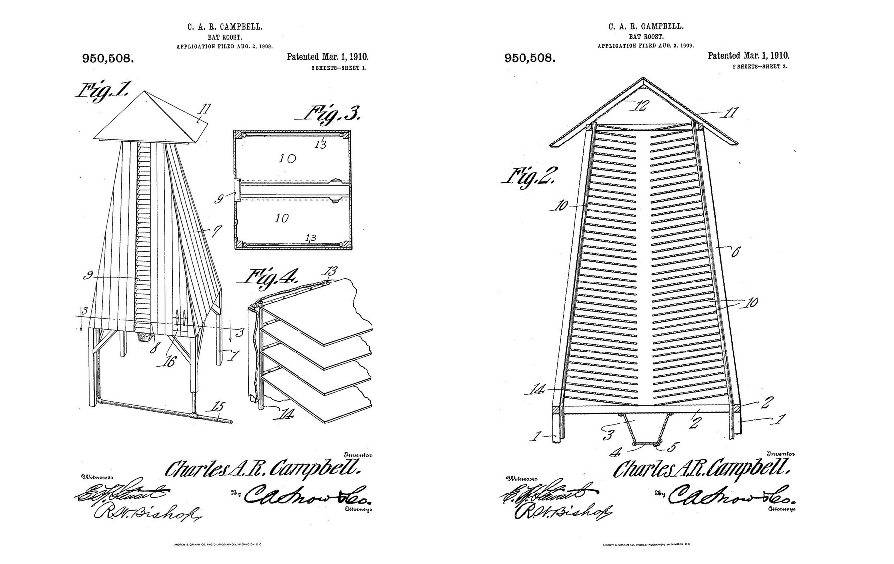 Чертеж насеста для летучих мышей из патента, зарегистрированного Чарльзом Кэмпбеллом 1 марта 1910 года. Слева — общий вид. Справа — в разрезе. 1 — опорные столбы; 3 — сборник для гуано; 4 — поворотное дно для эвакуации гуано; 8 — отверстия для входа и выхода летучих мышей; 10 — полки-насесты для животных; 11 — крыша; 15 — трубка, через которую можно подать дезинфицирующие средства; 16 — дверь, через которую можно войти, чтобы помочь упавшим вниз зверькам и вернуть их на полки. Рисунки с сайта texashistory.unt.edu