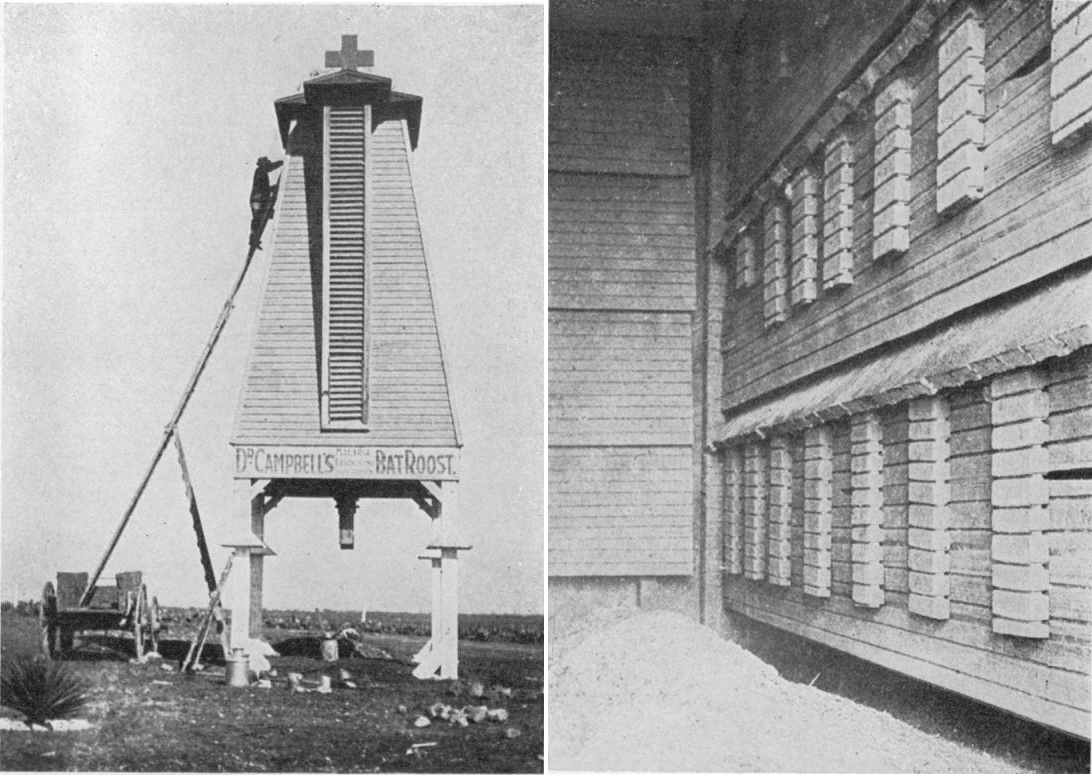 Слева — дом для летучих мышей, построенный Чарльзом Кэмпбеллом на берегу озера Митчелл, недалеко от города Сан-Антонио. Это была уже вторая башня Кэмпбелла, ее строительство было завершено 2 апреля 1911 года. Справа — домик изнутри: внизу — яма, заполненная мышиным гуано; на стене — полки для «летнего» насеста; над наклонными полками видны темные щели, ведущие в другие части летнего насеста. Фотографии сделаны 10 января 1919 года. Фото из статьи: Tracy I. Storer, 1926. Bats, Bat Towers and Mosquitoes