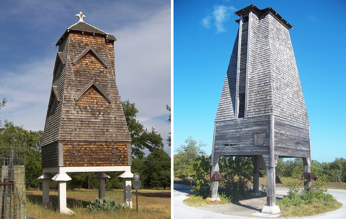 Две дошедшие до XXI века башни, построенные по чертежам доктора Кэмпбелла. Слева — башня в округе Кендалл в Техасе, построенная в 1918 году (см. Hygieostatic Bat Roost). Фото с сайта en.wikipedia.org. Справа — башня во Флориде, построенная в 1929 году (см. Sugarloaf Key Bat Tower). В 2017 она была разрушена ураганом Ирма. Фото с сайта en.wikipedia.org