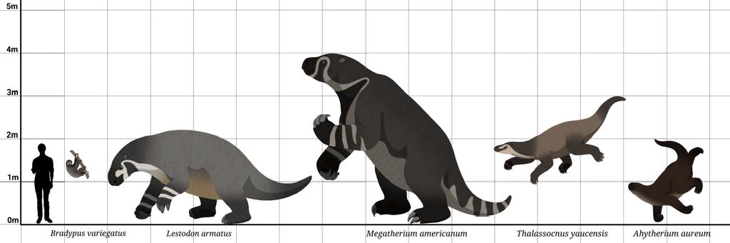 Некоторые представители ленивцевых, слева направо: современный бурогорлый ленивец (Bradypus variegatus), роющий лестодон (Lestodon), наземный мегатерий, морской талассокнус и пресноводный ахитерий (Ahytherium). Силуэт человека приведен для масштаба. Рисунок © TroodonVet из личного твиттера художника