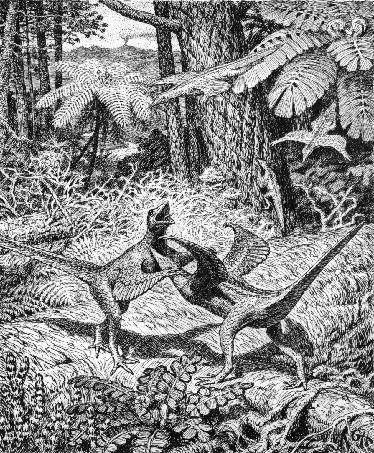 Сейчас общепризнано, что птицы произошли от тероподовых динозавров и, как следствие, сами являются динозаврами (согласно кладистической систематике). Об этом прямым текстом пишут не только в научных статьях, но и в популярных книгах, и эта иллюстрация со сражающимися длиннохвостыми животными, покрытыми перьями, в наши дни никого бы не удивила. Вот только нарисована она была больше ста лет назад, в 1916 году, когда в вопросах происхождения птиц, перьев и полета было куда меньше ясности.