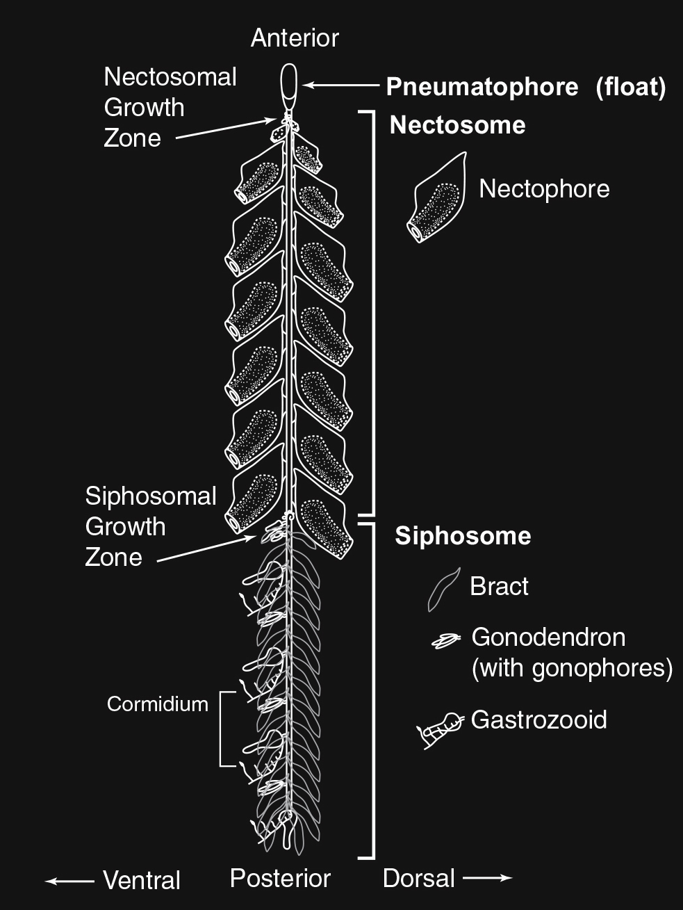 Строение сифонофоры из группы физонект. На переднем конце расположен пневматофор (pneumatophore), за ним следует нектосома (nectosome) — отдел с нектофорами (nectophores), движущими зооидами; сифосома (siphosome) — отдел с зооидами разных функциональных типов. Гонодендрон (gonodedron) — репродуктивная структура из нескольких зооидов-гонофоров (gonophores). Гастрозооид (gastrozooid) — питательный зооид. Кормидий (cormidium) — повторяющаяся группа зооидов. Рисунок из статьи C. W. Dunn, G. P. Wagner, 2006. The evolution of colony-level development in the Siphonophora (Cnidaria: Hydrozoa)