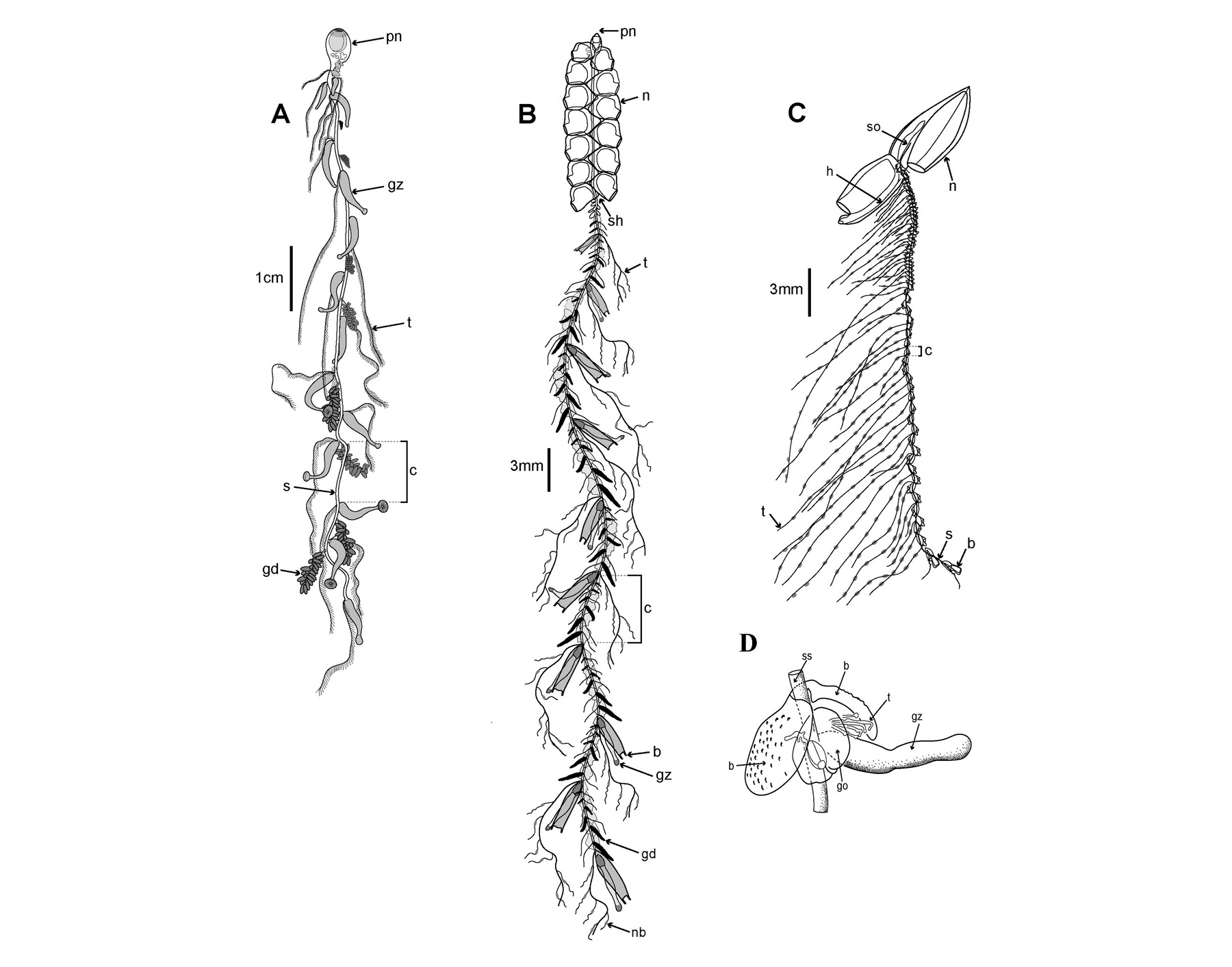 План строения сифонофор трех групп. A — цистонекта Rhizophysa eysenhardti; B — физонекта Nanomia bijuga; C — каликофора Lensia conoidea; D — строение кормидия каликофоры Rosacea cymbiformis. Условные обозначения: pn — пневматофор; gz — гастрозооид; t — щупальце; c — кормидий; s — ствол; gd — гонодендрон; n — нектофор; sh — сифосомный рог (выступ ствола, где формируются новые кормидии); b — прицветник; nb — батарея книдоцитов; so — соматоциста; h — гидроэций; ss — сифосомный ствол; go — гонофор. Рисунок из статьи G. M. Mapstone, 2014. Global Diversity and Review of Siphonophorae (Cnidaria: Hydrozoa)