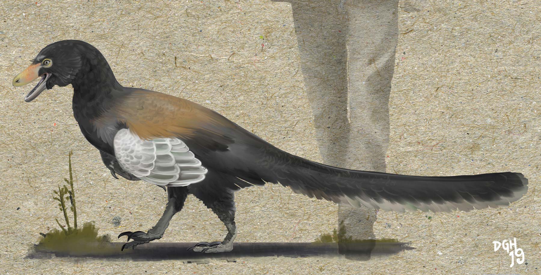 Реконструкция балаура как авиала, сидящего на ветке: обратите внимание на его задние когти, которые выглядят далеко не так устрашающе, как у велоцираптора. Рисунок © Emily Willoughby с сайта en.wikipedia.org