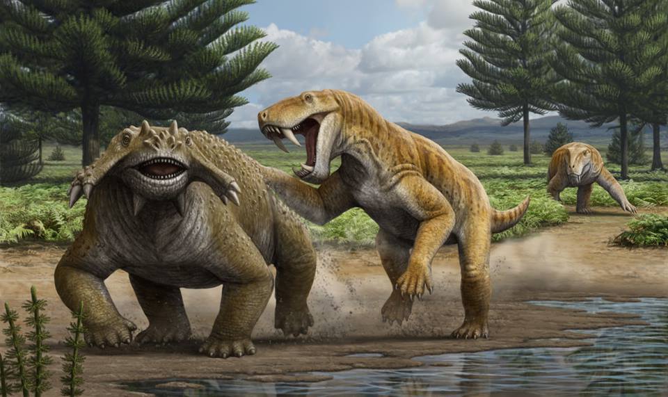 Нападение горгонопса иностранцевии на парейазавра скутозавра: длинные сабельные клыки хищника позволяли ему пронзить укрепленную кожными окостенениями шкуру жертвы. Рисунок © Mauricio Antón из книги M. Anton, 2013. Sabertooth