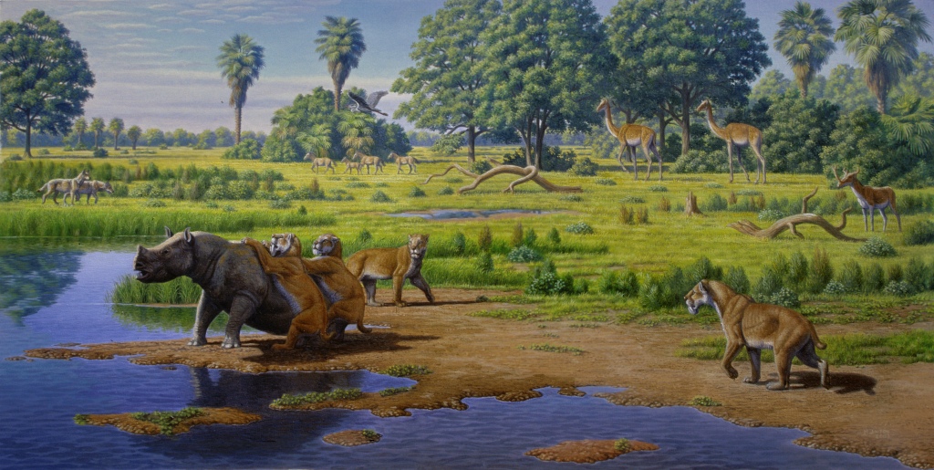 Пейзаж миоценовой Флориды. Слева направо, задний план: пара борофаговых собак эпиционов бредет по берегу озера, еще дальше можно увидеть небольшой табун неогиппарионов и пару примитивных верблюдов эпикамелюсов, а справа стоит одинокий синтетоцерас. На переднем плане семейство барбурофелисов охотится на носорога телеоцераса: мать (она крайняя слева) и один из детенышей пытаются повалить добычу наземь, тогда как второй детеныш всё еще медлит — и это когда к семейству уже приближается другой взрослый барбурофелис. Рисунок © Mauricio Antón из книги M. Anton, 2013. Sabertooth