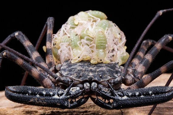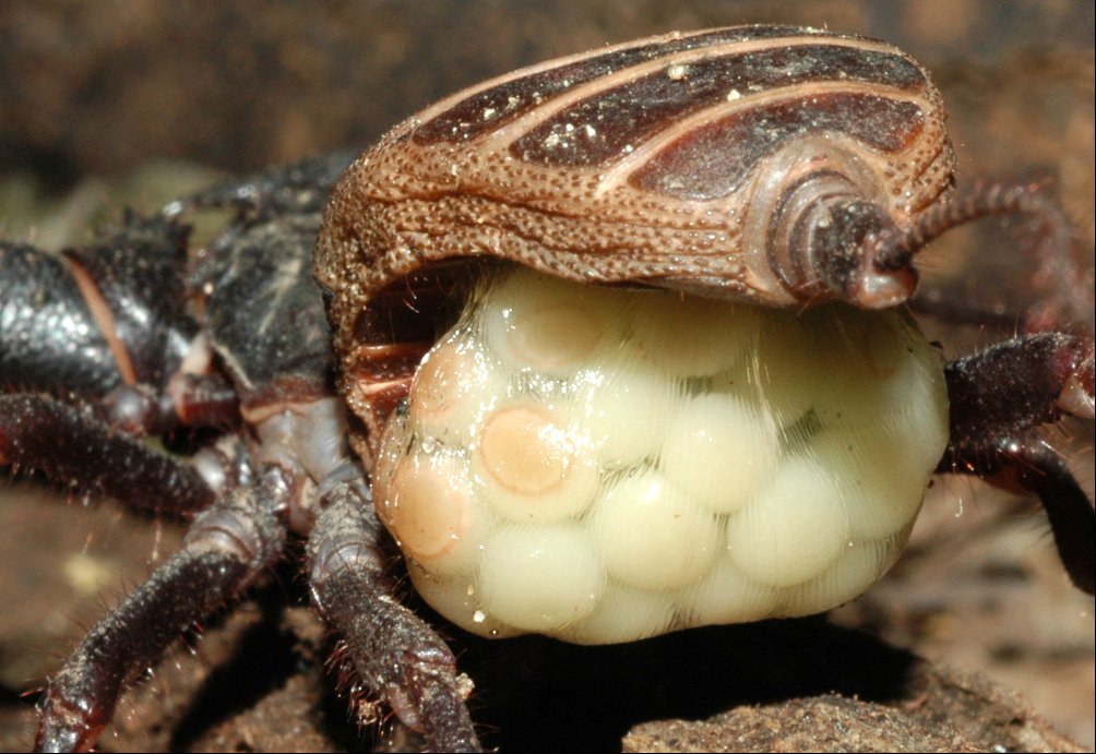 Самка роет норку, откладывает яйца в мешочек на брюшке. В этой норке спустя два месяца появляются на свет детишки, сразу забираются к маме на спину. Расставание с родительницей и самостоятельная жизнь начнутся после первой линьки, в возрасте одного месяца. Самка, заботясь о потомстве, не покидает норку и не питается, поэтому к моменту, когда отпрыски ее покидают, она настолько истощена, что погибает.