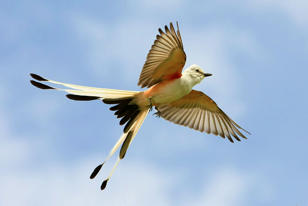 На фото — длиннохвостый тиранн (Tyrannus forficatus) в полете. У этих птиц совершенно невероятной красоты длинные хвосты (до 26 см), как у самцов, так и у самок, но у самцов примерно на 50% длиннее. Самцы во время брачного полета совершают зигзагообразные движения, резко опускаясь и вновь поднимаясь, делают обратные сальто, складывают и раскрывают удлиненные краевые перья хвоста, подобно ножницам. За это на английском их называют scissor-tailed flycatcher, то есть «ножницехвостая мухоловка». Хотя к мухоловкам эта птица отношения не имеет, она принадлежит к семейству тиранновых.