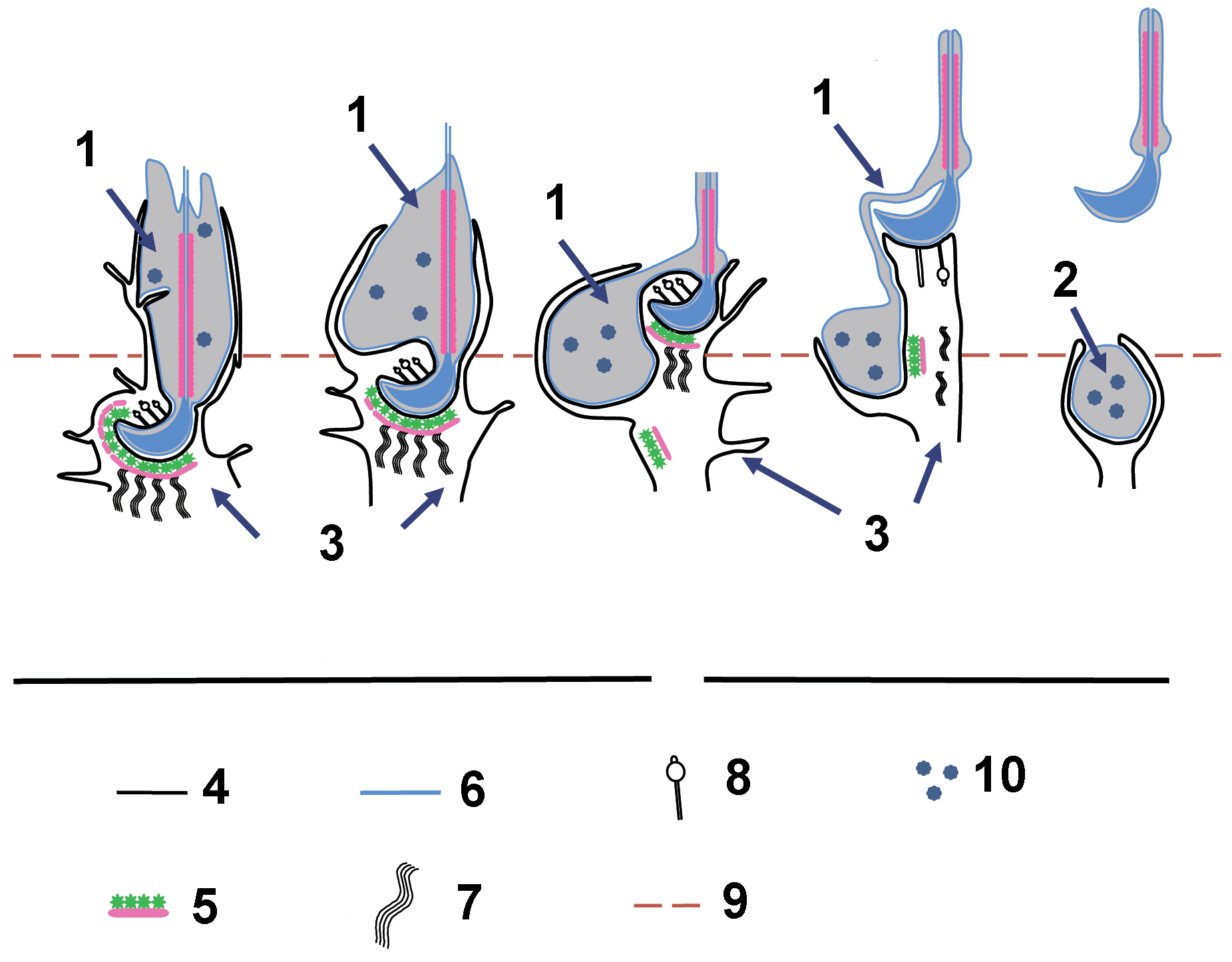 Схематическое изображение процесса спермиации — высвобождения зрелых сперматид из объятий клетки Сертоли. 1 — цитоплазма сперматиды; 2 — остаточное тельце: органеллы и часть цитоплазмы сперматиды; 3 — цитоплазма клетки Сертоли; 4 — плазматическая мембрана клетки Сертоли; 5 — структура, через которую сперматида взаимодействует с клеткой Сертоли; 6 — плазматическая мембрана сперматиды; 7 — микротрубочки; 8 — комплекс, удаляющий межклеточные контакты между клеткой Сертоли и сперматидой; 9 — эпителий семявыносящего канальца; 10 — органеллы сперматиды. Рисунок из статьи L. O'Donnel et al., 2011. Spermiation. The process of sperm release