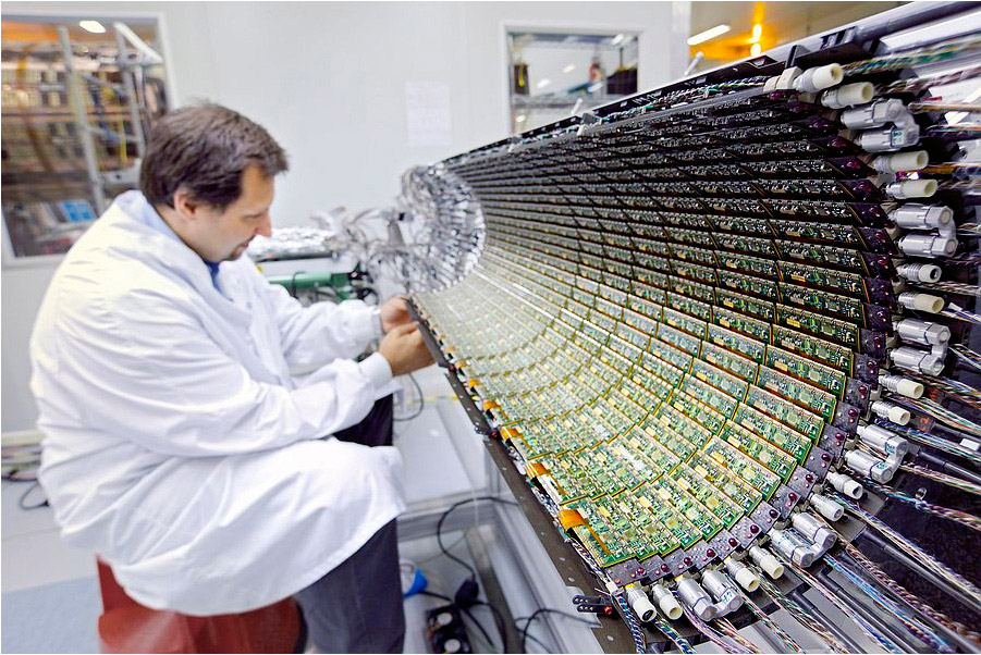 Внешний слой пиксельного детектора ATLAS в процессе монтажа. Фото с сайта atlasexperiment.org