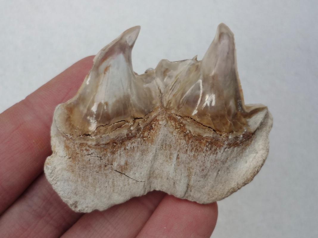 Зуб акулы отодус (Otodus) из Марокко с двумя коронками. Фото Тимофея Сокольского с сайта ammonit.ru