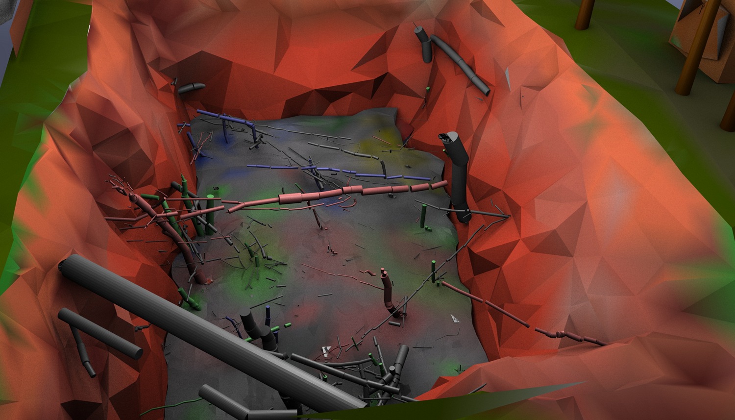 На этой трехмерной реконструкции представлены стволы ископаемых деревьев в том положении, в каком они были найдены участниками раскопок, проводившихся в немецком городе Хемниц несколько лет назад. Голубым цветом обозначены древовидные папоротники Psaroniaceae, красным — каламиты (Calamites, древовидные хвощи), зеленым — семенные папоротники Medullosales и серым — кордаиты (Cordaites, хвойные). Именно эти четыре группы растений составляли основу того леса, который рос на территории Хемница в начале пермского периода, около 290 миллионов лет назад.