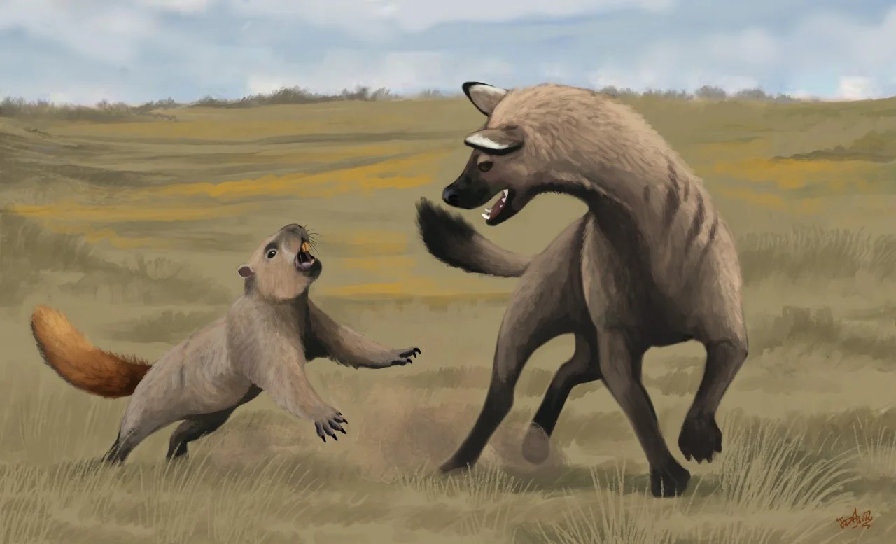 Около трех миллионов лет назад на плиоценовых равнинах доисторической Северной Америки гигантский сурок пэнемармота (Paenemarmota, «почти сурок») оказался застигнут врасплох, но не сдался без боя (эта сцена уж очень напоминает современную встречу лисы и сурка — см. картинку дня Тибетская лисица и сурок). Нарушителем его спокойствия оказался странный зверь, своими длинными стройными ногами напоминающий волка. Но это не волк и даже не его родич, это хазмапортетес (Chasmaporthetes ossifragus), или бегающая гиена — представитель уникальной эволюционной линии гиеновых, которая сделала ставку не на мощные челюсти, а на быстрые ноги. Его предки перешли по Берингову перешейку и распространились от Аляски до Мексики. Странное латинское название зверя переводится как «опустошитель каньона, ломающий кости», так как он мог застать появление Большого каньона 5–6 миллионов лет назад.