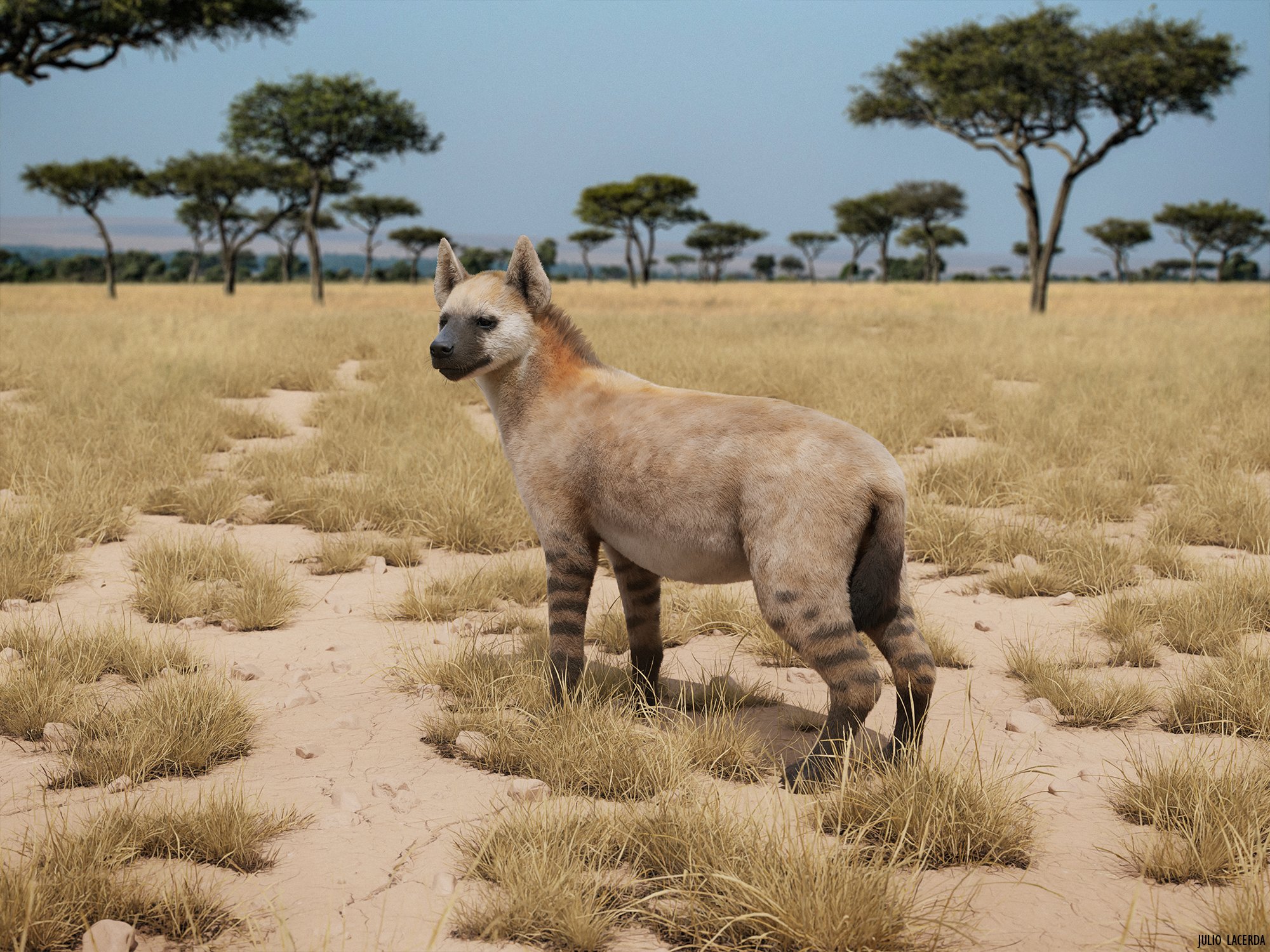 Хазмапортетес скорее напоминал волка, чем привычных нам гиен, и был способен на огромной скорости настигать даже очень быструю добычу вроде примитивных лошадей и верблюдов. Рисунок © Julio Lacerda с сайта reddit.com